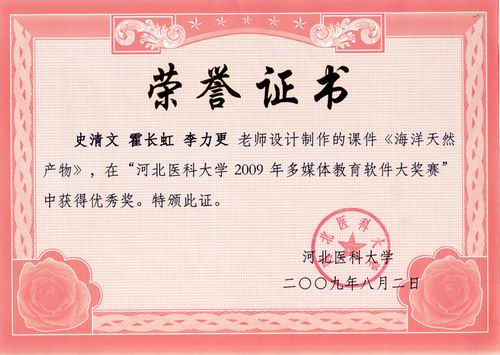 由我室教师史清文、霍长虹、李力更设计制作的教学课件《海洋天然产物》在萝莉岛 2009年多媒体教育教学软件大奖赛中获得优秀奖。