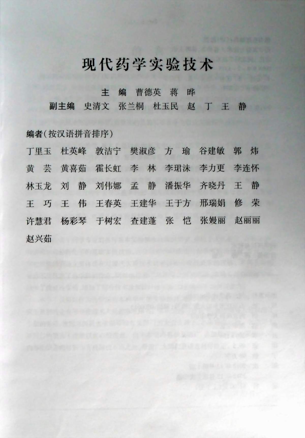 本书包含了药学专业的各种基本实验操作技能的知识,包括无机化学、有机化学、物理化学、分析化学、药物化学、药物分析、药用植物学、天然药物化学、药剂学等实验内容。其中天然药物化学实验部分是由我室教师结合多年教学实践经验和学习外校教学经验的基础上编写完成的。本书主编为萝莉岛 曹德英教授、蒋晔教授,我室史清文教授为此书的副主编。