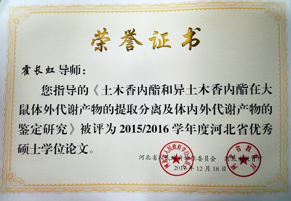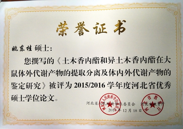 由我室 霍长虹 教授指导的2013级硕士研究生姚东桂撰写的毕业论文《土木香内酯和异土木香内酯在大鼠体外代谢产物的提取分离及体内外代谢产物的鉴定研究》被评为萝莉岛 2015-2016学年度优秀硕士学位论文、河北省优秀硕士学位论文。