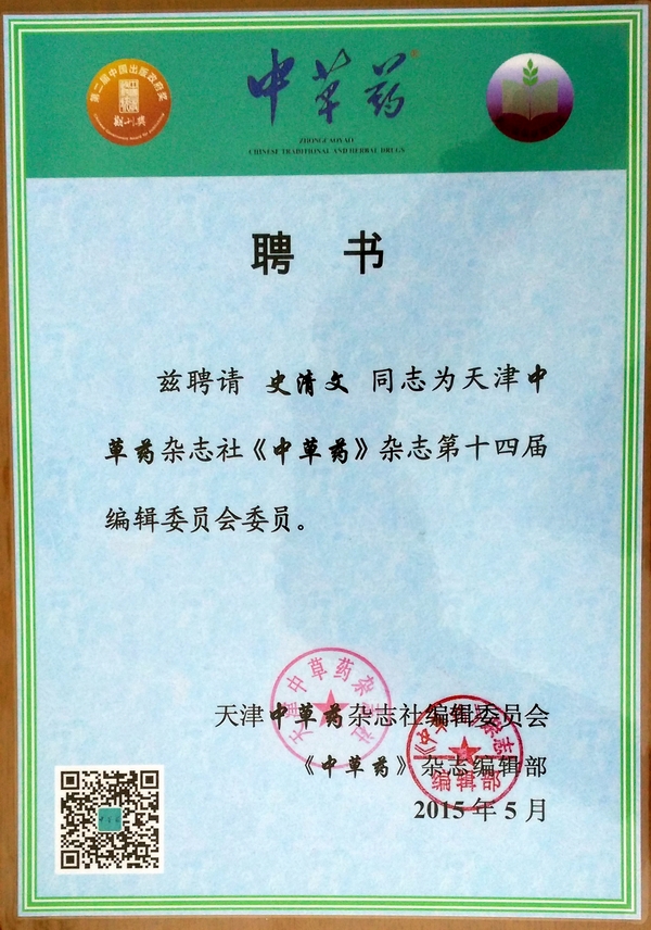在近日召开的《中草药》杂志社编委会议中,我室史清文教授再次被聘为《中草药》杂志编委。