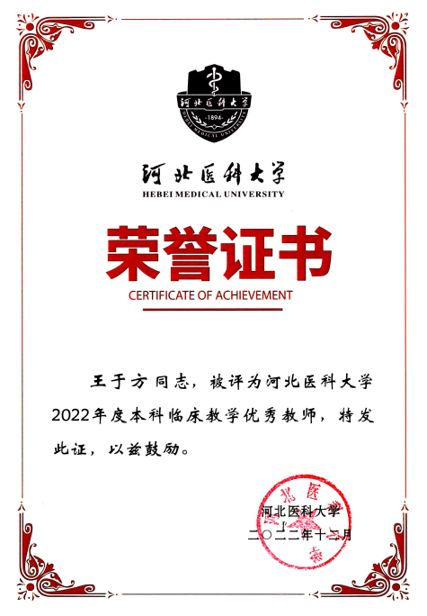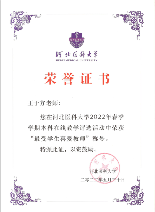 我室王于方老师荣获“萝莉岛 在线教学最受学生喜爱教师”及“本科临床教学优秀教师”称号。这是我室在本科生教学中继微课大赛、化学大赛等之后的又一佳绩。